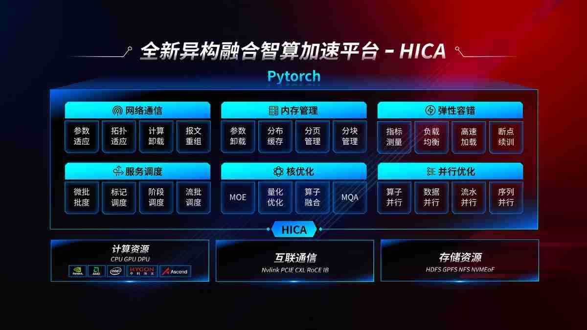通过自研的服务层、、、中间适配层、、以及调度编排算法,,,,采用数据并行、、模型并行等多种并行方式,,把并行计算任务进行有效的分解,,,使其分别由相应的软件栈和算力资源来承接。。。当GPU资源变化,,HICA可以实时动态调度计算子任务并调整模型拓扑和架构,,以充分聚合各种算力资源。。。。